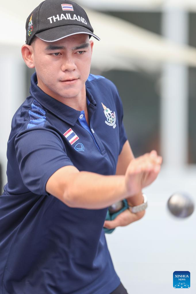 Ratchata Khamdee of Thailand competes during the Boules Sports Men's Petanque Precision Shooting Bronze Medal Match against Mohamed Khaled Bougriba of Tunisia at The World Games 2025 in Chengdu, southwest China's Sichuan Province, Aug. 16, 2025. (Xinhua/Zhang Liyun)