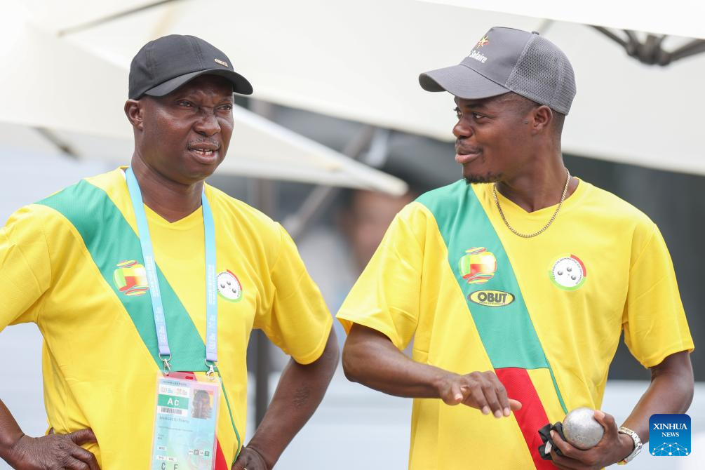 Marcel Gbetable (R) of Benin communicates with his coach during the Boules Sports Men's Petanque Precision Shooting Gold Medal Match against Andrea Chiapello of Italy at The World Games 2025 in Chengdu, southwest China's Sichuan Province, Aug. 16, 2025. (Xinhua/Zhang Liyun)