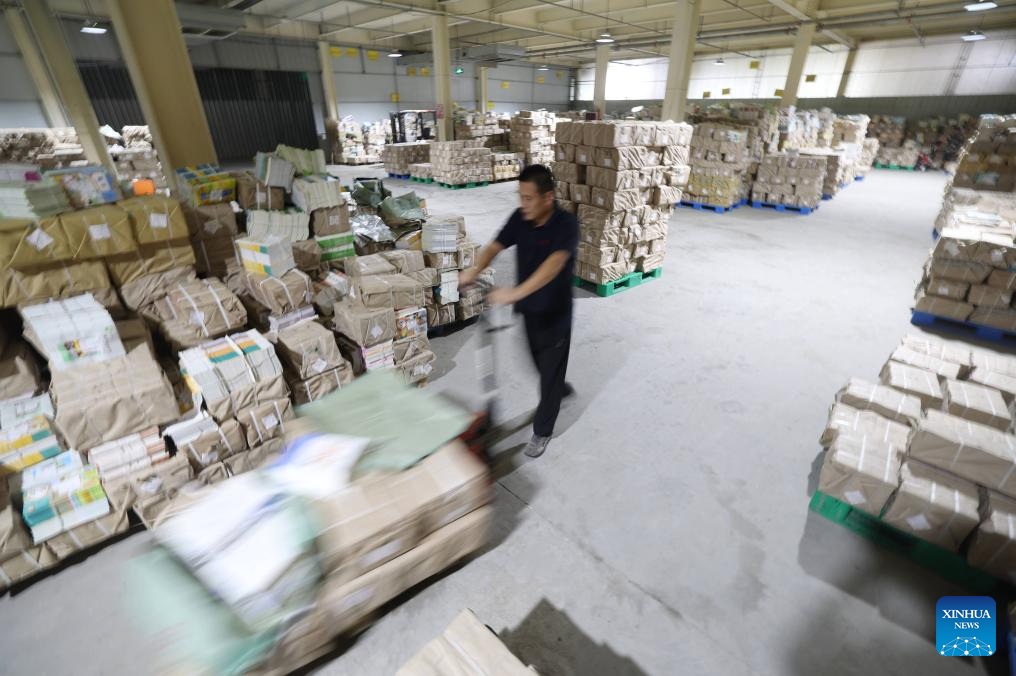 A staff member moves textbooks for the upcoming new semester at a warehouse in Linyi City, east China's Shandong Province, Aug. 16, 2025. Schools and bookstores across the country are getting textbooks ready for the upcoming new semester. (Photo by Wang Yanbing/Xinhua)