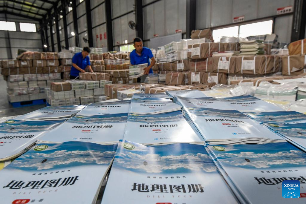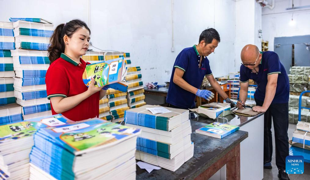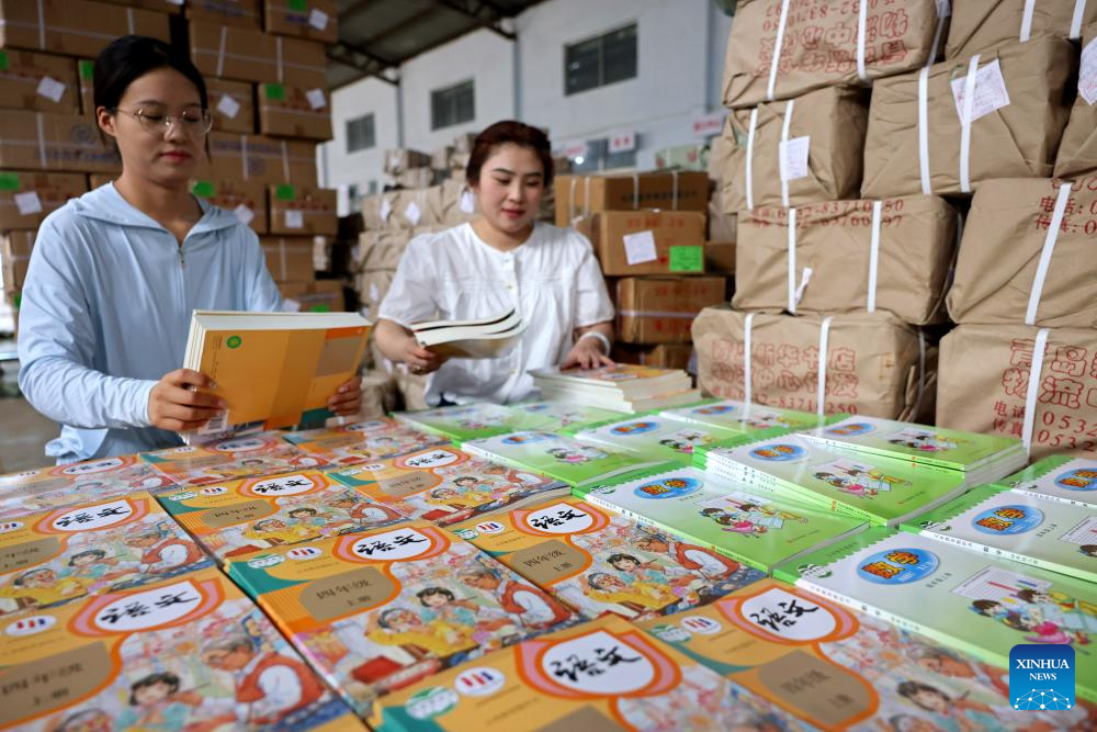 Staff members pack textbooks for the upcoming new semester at a publisher in Anshun City, southwest China's Guizhou Province, Aug. 16, 2025. Schools and bookstores across the country are getting textbooks ready for the upcoming new semester. (Photo by Chen Xi/Xinhua)