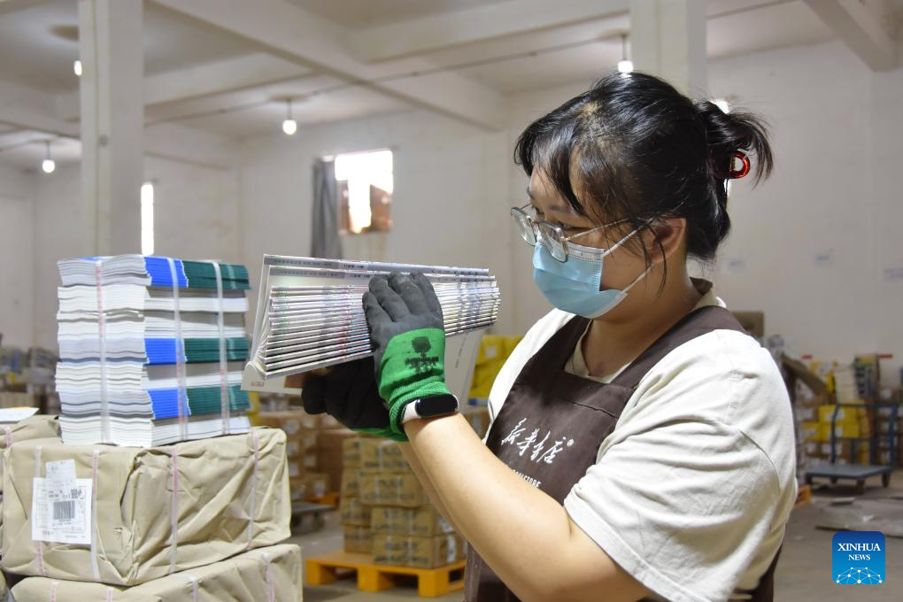 A staff member sorts out textbooks for the upcoming new semester at a warehouse in Shijiazhuang City, north China's Hebei Province, Aug. 16, 2025. Schools and bookstores across the country are getting textbooks ready for the upcoming new semester. (Photo by Zhang Xiaofeng/Xinhua)