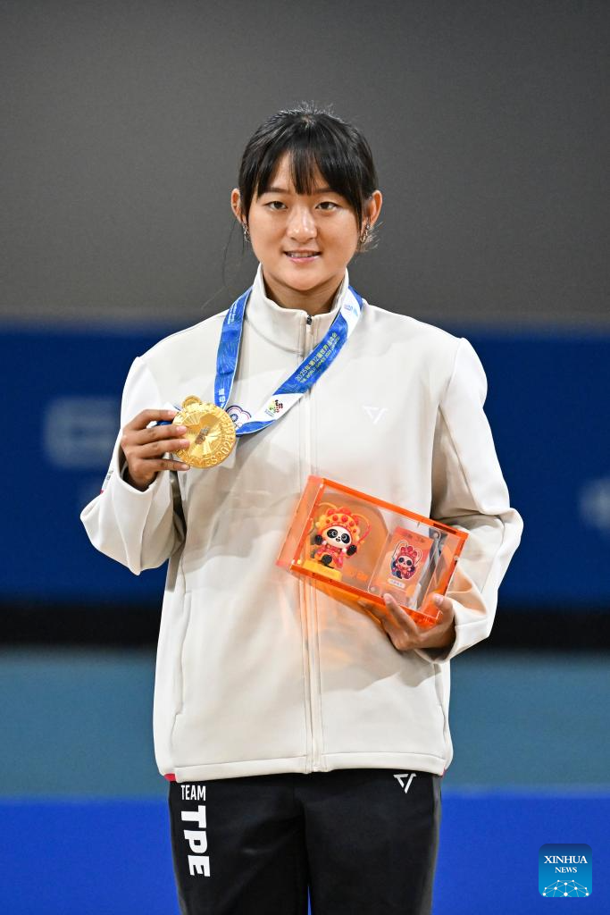 Gold medalist Liu Chiao-Hsi of Chinese Taipei poses during the victory ceremony for the Inline Freestyle Skating Women's Speed Slalom at The World Games 2025 in Chengdu, southwest China's Sichuan Province, Aug. 16, 2025. (Xinhua/Xie Jianfei)