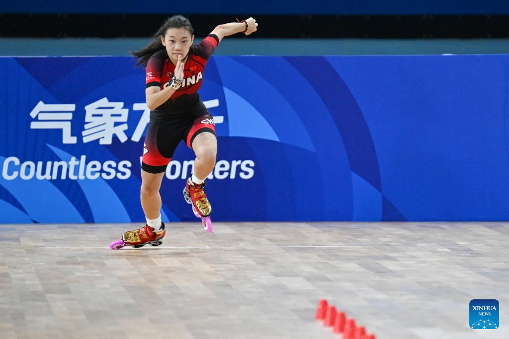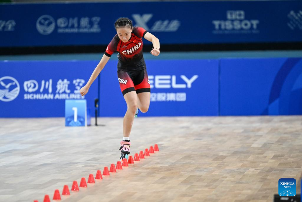 Zhu Siyi of China competes during the Women's Speed Slalom Gold Medal Final against Liu Chiao-Hsi of Chinese Taipei of Inline Freestyle Skating event at The World Games 2025 in Chengdu, southwest China's Sichuan Province, Aug. 16, 2025. (Xinhua/Xie Jianfei)