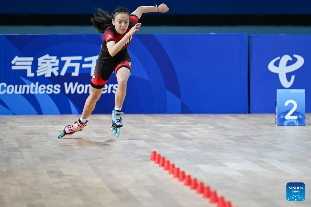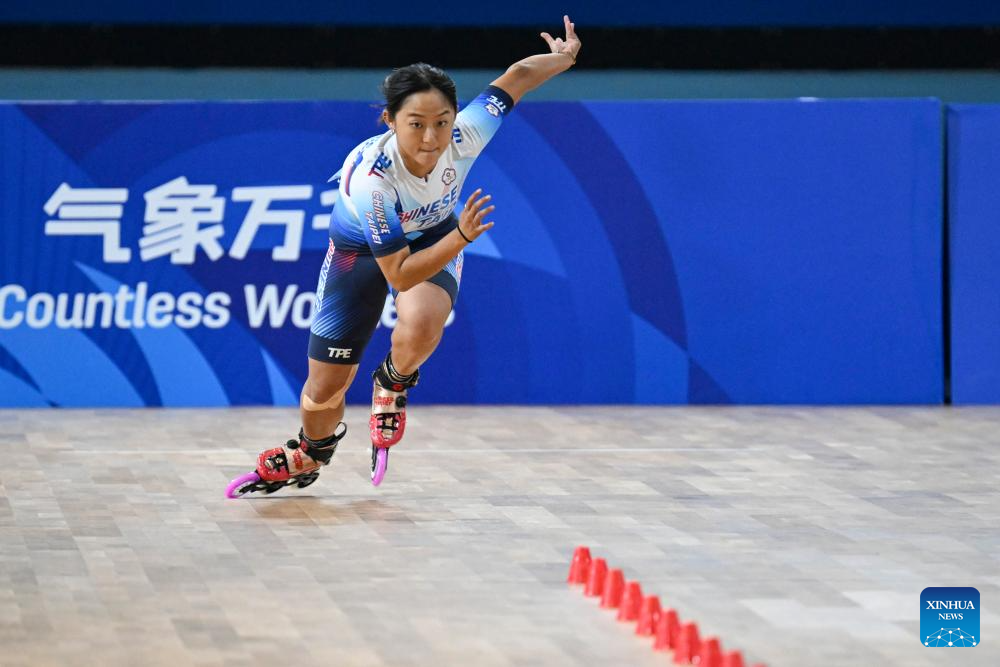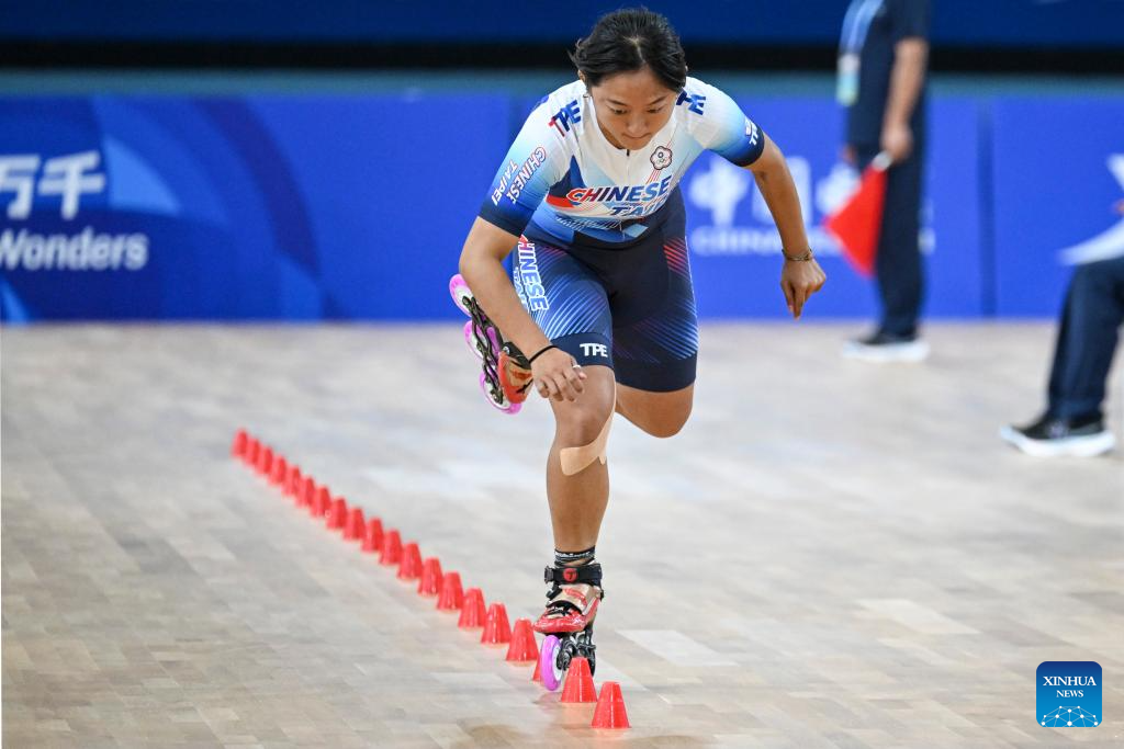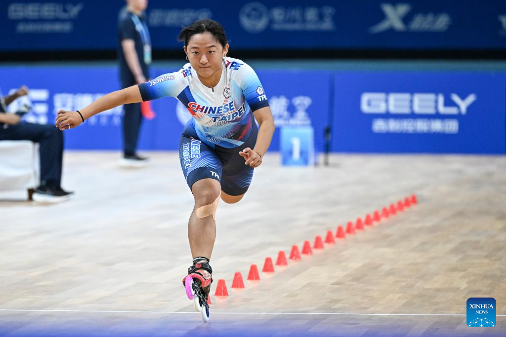 Liu Chiao-Hsi of Chinese Taipei competes during the Women's Speed Slalom Gold Medal Final against Zhu Siyi of China of Inline Freestyle Skating event at The World Games 2025 in Chengdu, southwest China's Sichuan Province, Aug. 16, 2025. (Xinhua/Xie Jianfei)