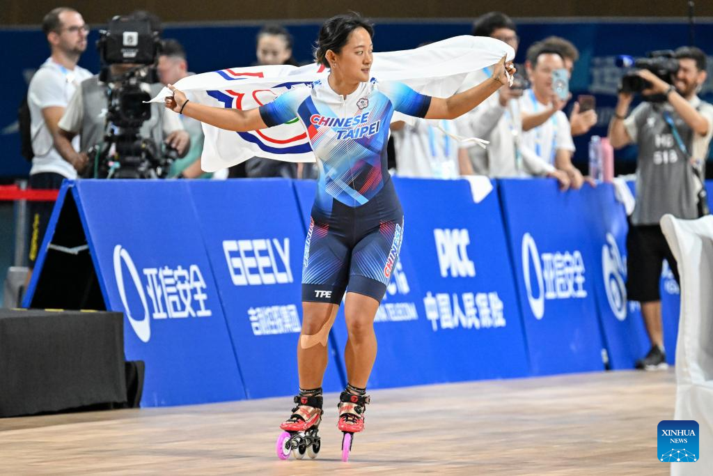 Liu Chiao-Hsi of Chinese Taipei celebrates after the Women's Speed Slalom Finals of Inline Freestyle Skating event at The World Games 2025 in Chengdu, southwest China's Sichuan Province, Aug. 16, 2025. (Xinhua/Xie Jianfei)