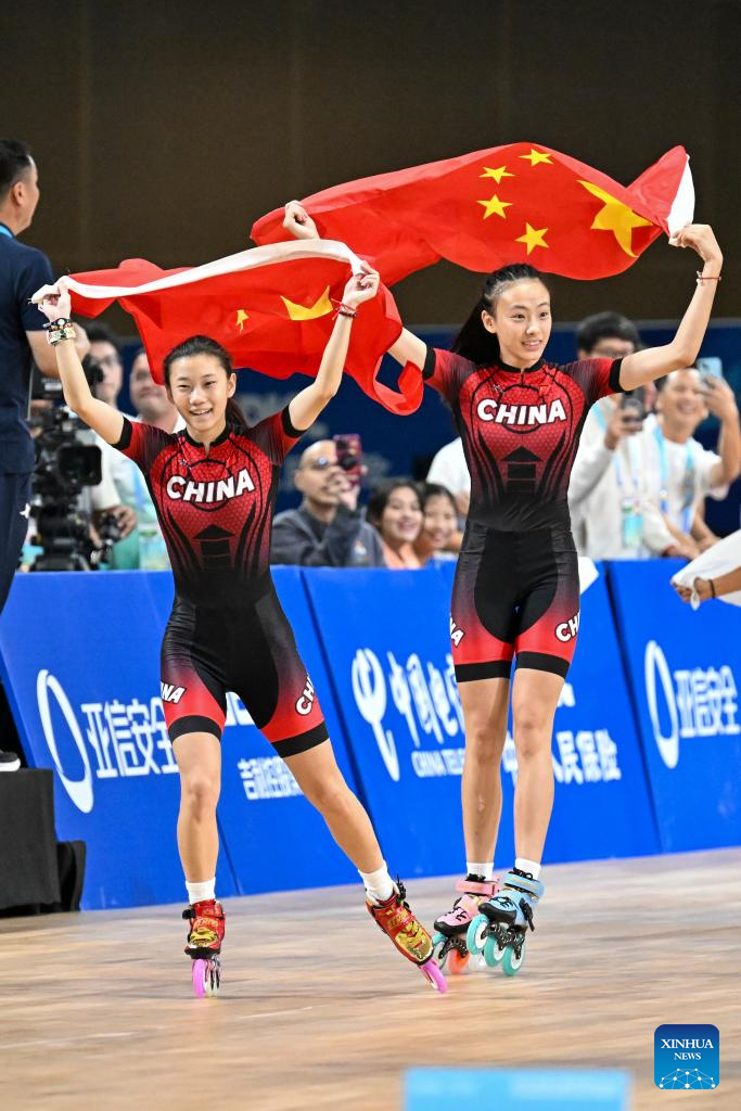 Zhu Siyi (R) and Wen Jingjing of China celebrate after the Women's Speed Slalom Finals of Inline Freestyle Skating event at The World Games 2025 in Chengdu, southwest China's Sichuan Province, Aug. 16, 2025. (Xinhua/Xie Jianfei)