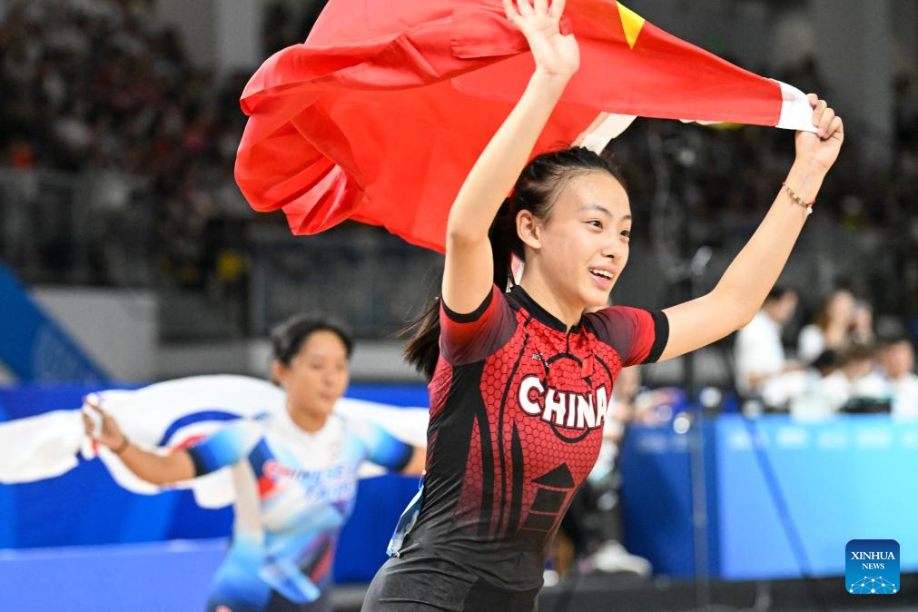 Wen Jingjing of China celebrates after the Women's Speed Slalom Finals of Inline Freestyle Skating event at The World Games 2025 in Chengdu, southwest China's Sichuan Province, Aug. 16, 2025. (Xinhua/Xie Jianfei)