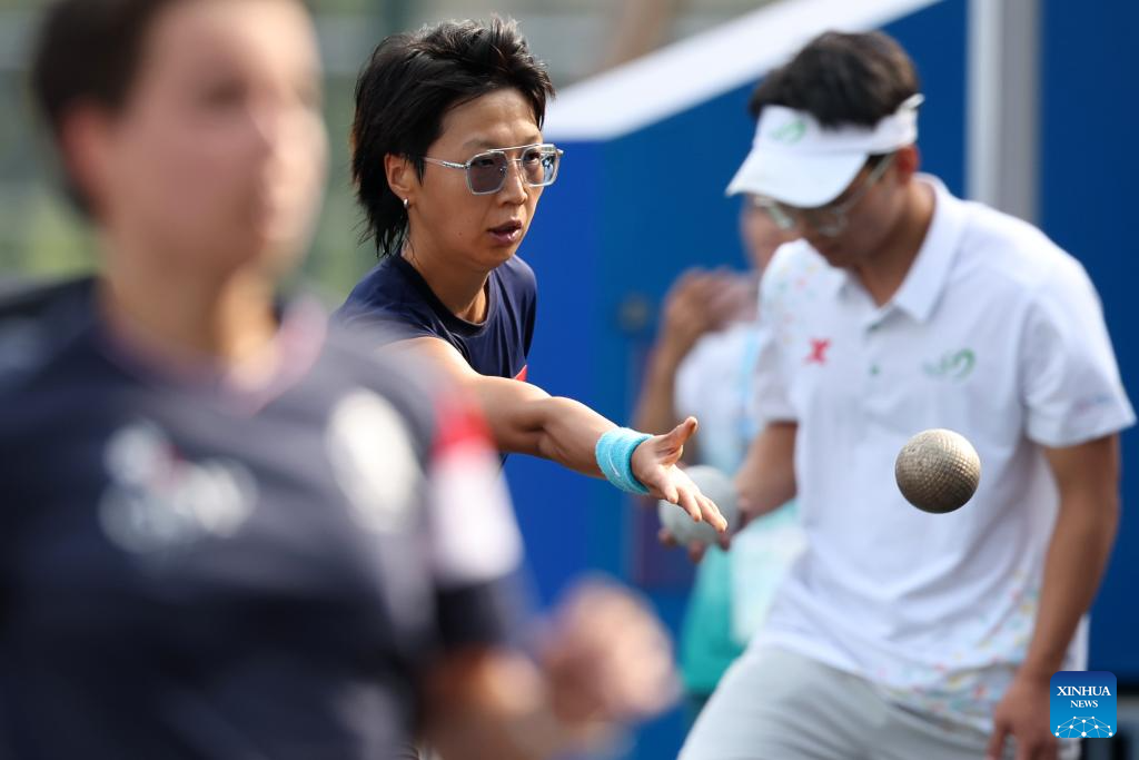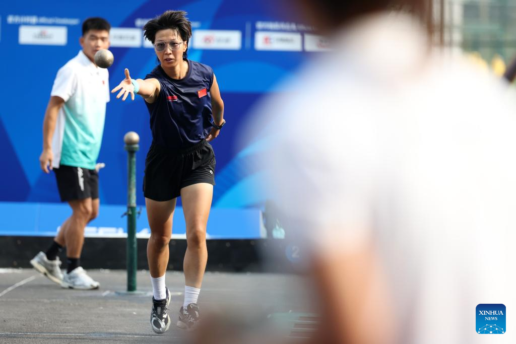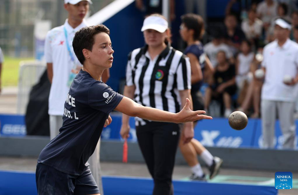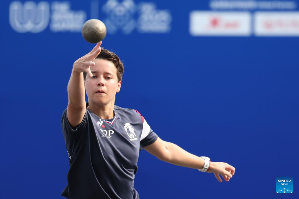 Wang Chenyi of China competes during the Boules Sports Women's Lyonnaise Progressive Semifinal Match against Lisa Gouilloud of France at The World Games 2025 in Chengdu, southwest China's Sichuan Province, Aug. 17, 2025. (Xinhua/Chen Bin)