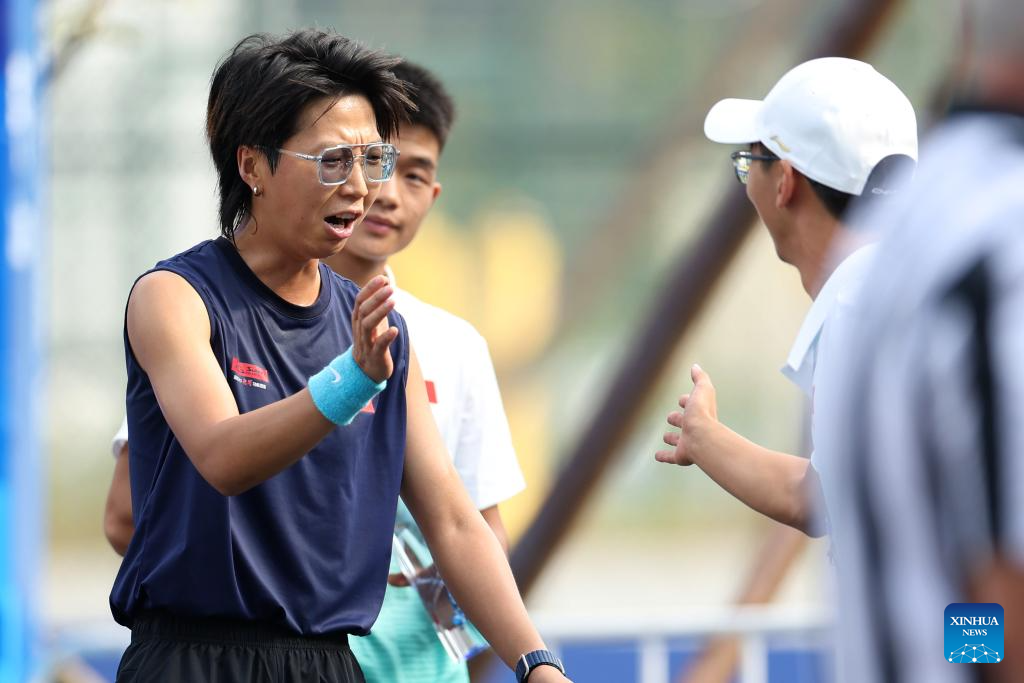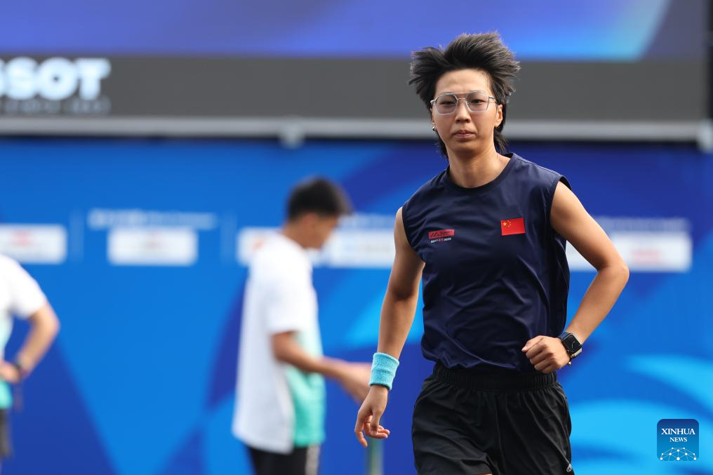 Wang Chenyi of China reacts during the Boules Sports Women's Lyonnaise Progressive Semifinal Match against Lisa Gouilloud of France at The World Games 2025 in Chengdu, southwest China's Sichuan Province, Aug. 17, 2025. (Xinhua/Chen Bin)