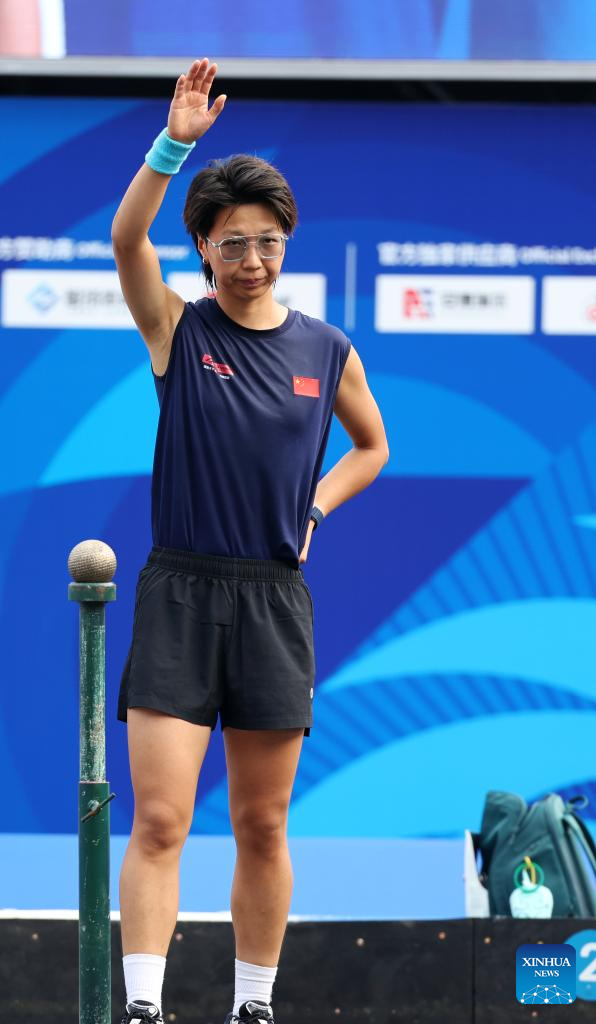 Wang Chenyi of China celebrates after winning the Boules Sports Women's Lyonnaise Progressive Semifinal Match against Lisa Gouilloud of France at The World Games 2025 in Chengdu, southwest China's Sichuan Province, Aug. 17, 2025. (Xinhua/Chen Bin)