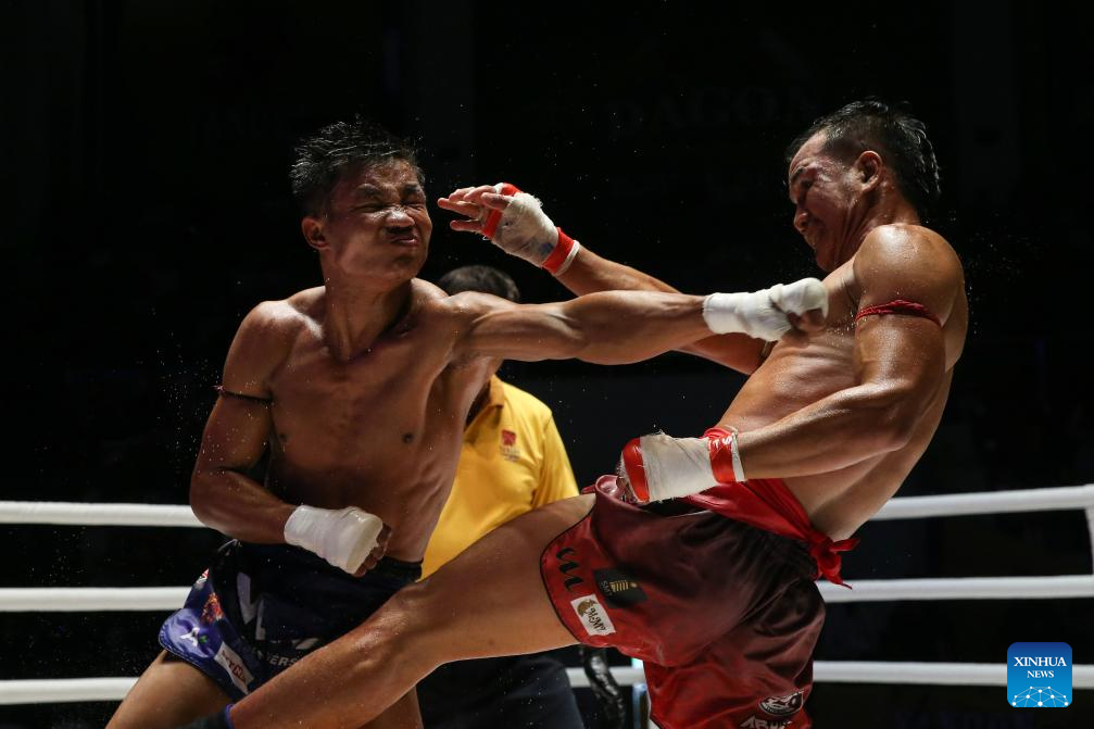 Naing Win Tun (L) of Myanmar competes against Thet Win Aung of Myanmar during a match of Myanmar Lethwei World Championship in Yangon, Myanmar, Aug. 17, 2025. (Xinhua/Myo Kyaw Soe)