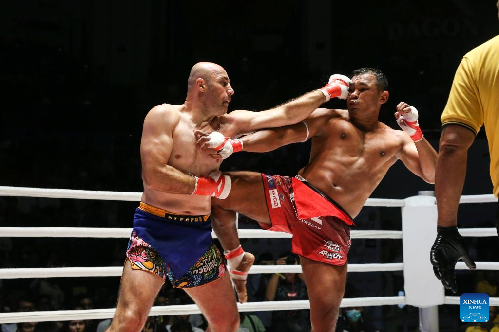 Tun Tun Min (R) of Myanmar fights against K One of Iran during a match of Myanmar Lethwei World Championship in Yangon, Myanmar, Aug. 17, 2025. (Xinhua/Myo Kyaw Soe)