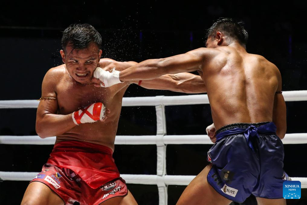 Saw Min Min (L) of Myanmar competes against Thway Thit Maung of Myanmar during a match of Myanmar Lethwei World Championship in Yangon, Myanmar, Aug. 17, 2025. (Xinhua/Myo Kyaw Soe)