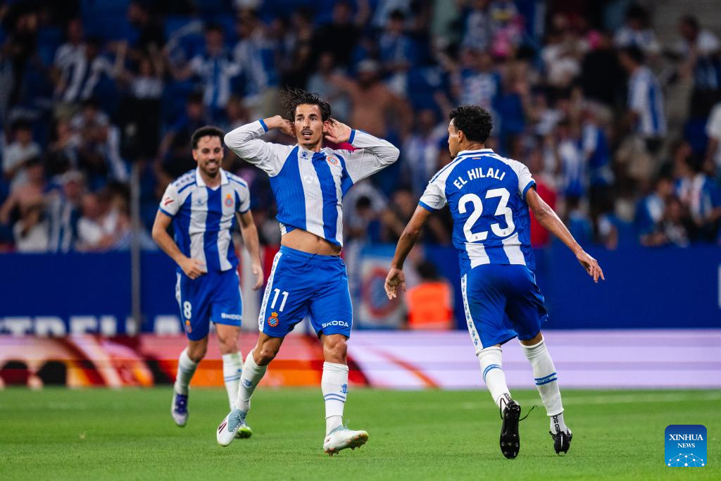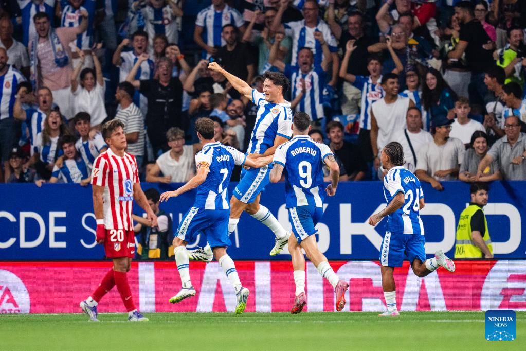Players of RCD Espanyol celebrate a goal during the Laliga football match between Atletico de Madrid and RCD Espanyol, in RCDE Stadium, Barcelona, Spain, on Aug. 17, 2025. (Photo by Joan gosa/Xinhua)