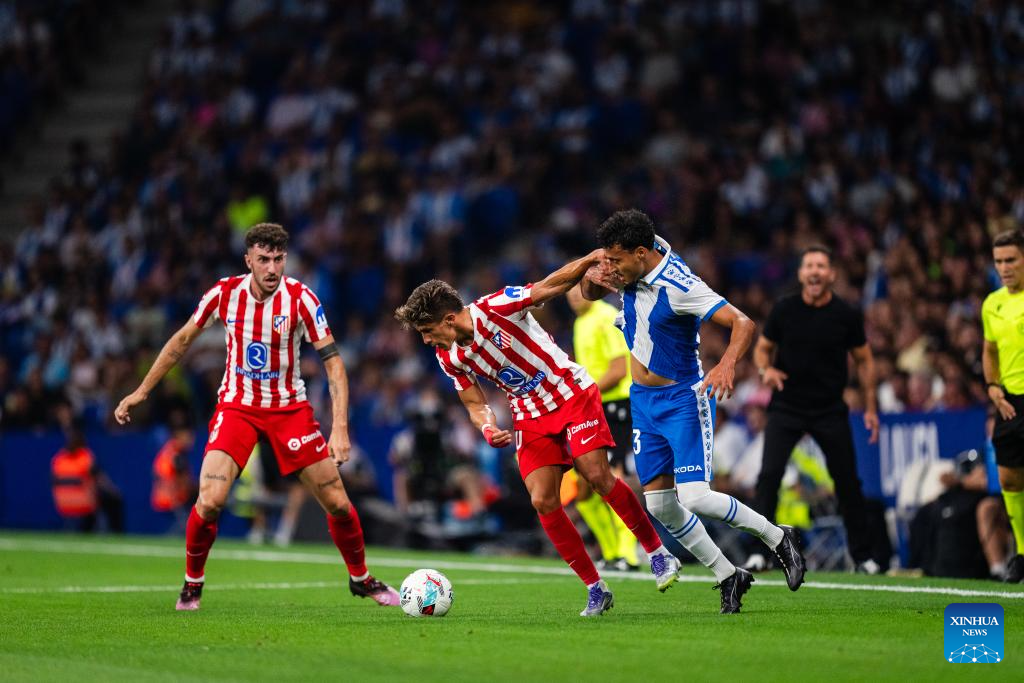 Giuliano Simeone (C) of Atletico de Madrid vies with Omar El Hilali (R) of RCD Espanyol during the Laliga football match between Atletico de Madrid and RCD Espanyol, in RCDE Stadium, Barcelona, Spain, on Aug. 17, 2025. (Photo by Joan gosa/Xinhua)