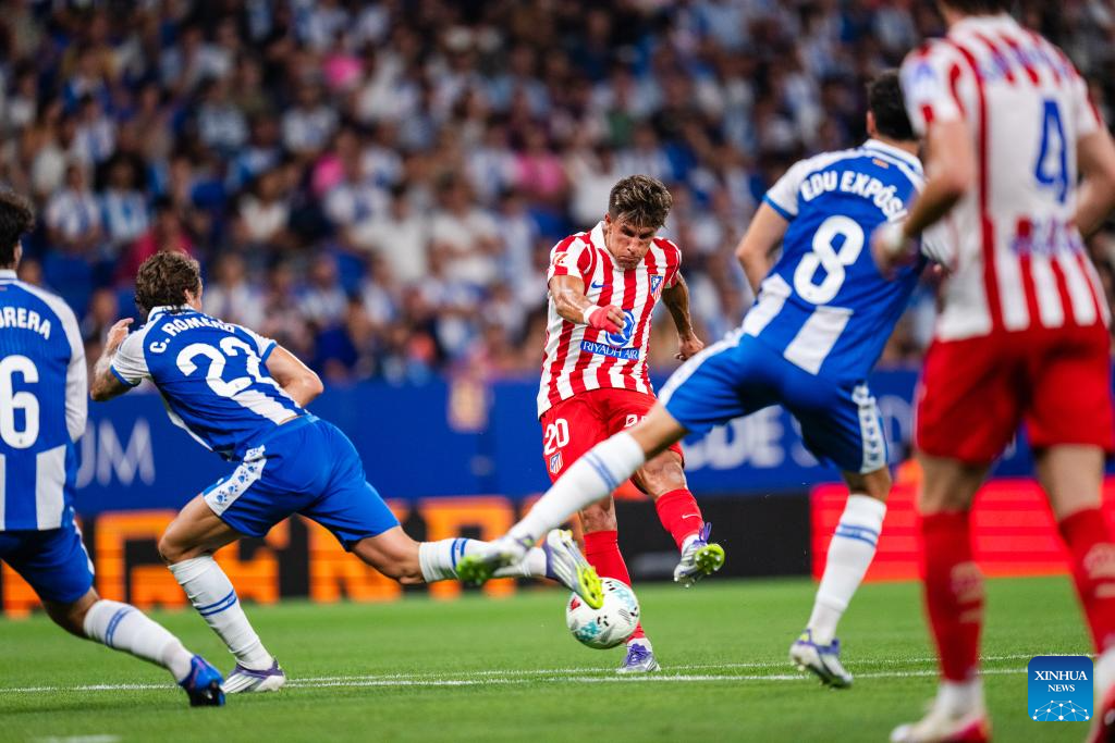 Giuliano (C) of Atletico de Madrid shoots to score during the Laliga football match between Atletico de Madrid and RCD Espanyol, in RCDE Stadium, Barcelona, Spain, on Aug. 17, 2025. (Photo by Joan gosa/Xinhua)