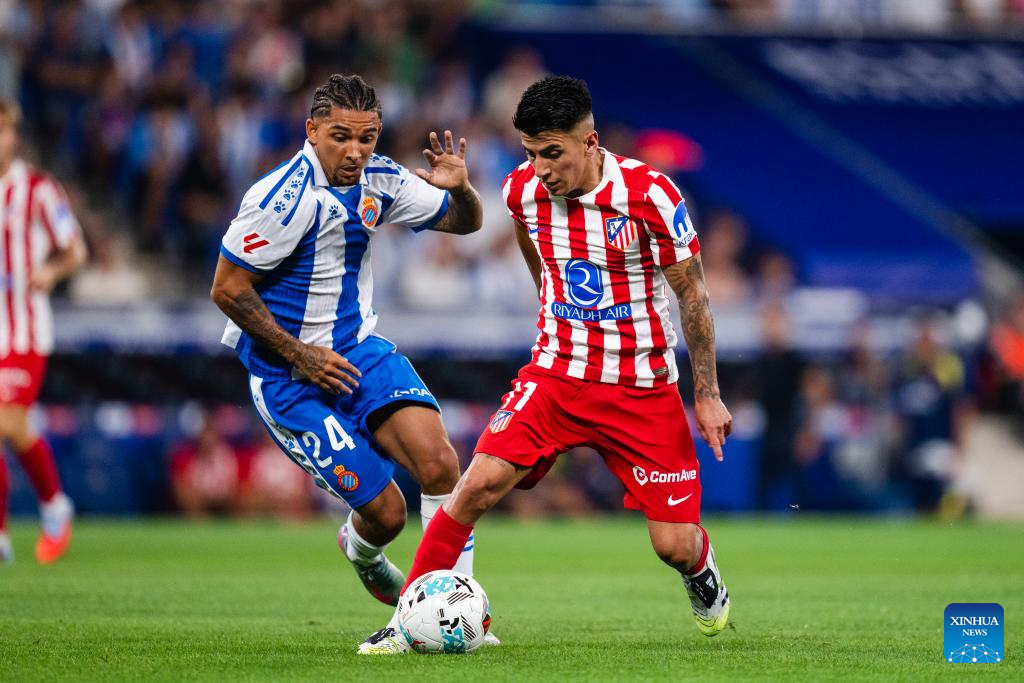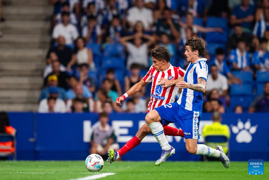 Giuliano Simeone (L) of Atletico de Madrid vies with Carlos Romero of RCD Espanyol during the Laliga football match between Atletico de Madrid and RCD Espanyol, in RCDE Stadium, Barcelona, Spain, on Aug. 17, 2025. (Photo by Joan gosa/Xinhua)