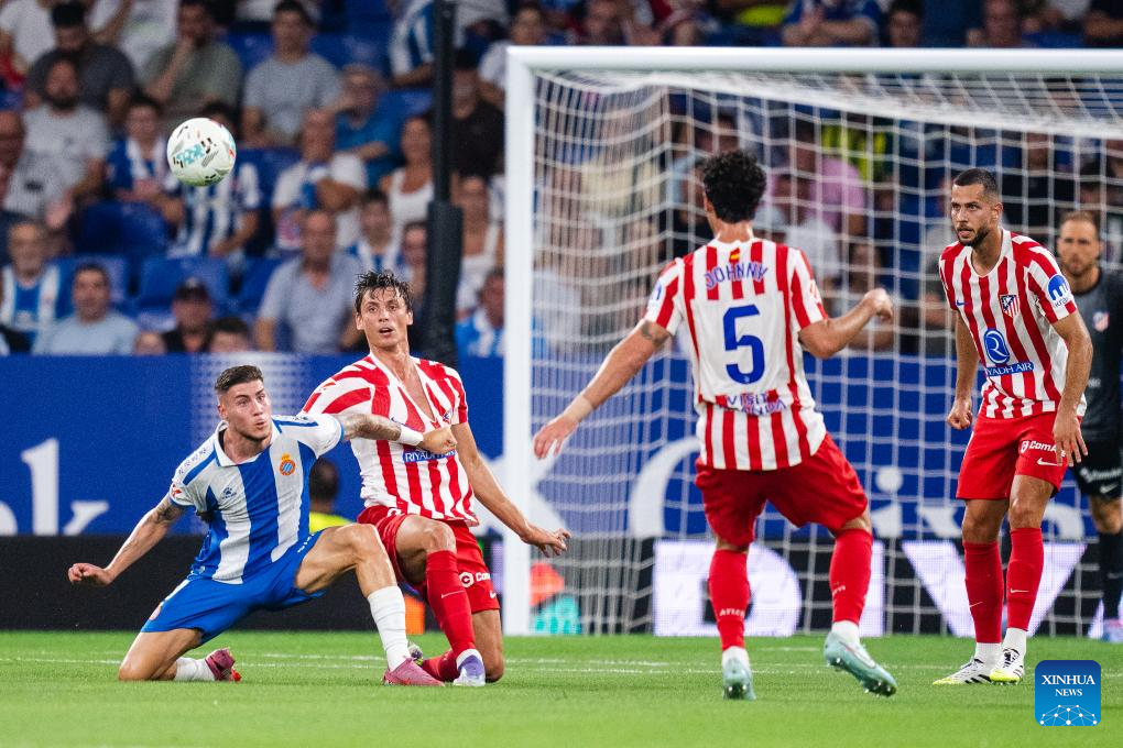 Le Normand (R) and Gallagher (L) of Atletico de Madrid vie with Calero of RCD Espanyol during the Laliga football match between Atletico de Madrid and RCD Espanyol, in RCDE Stadium, Barcelona, Spain, on Aug. 17, 2025. (Photo by Joan gosa/Xinhua)