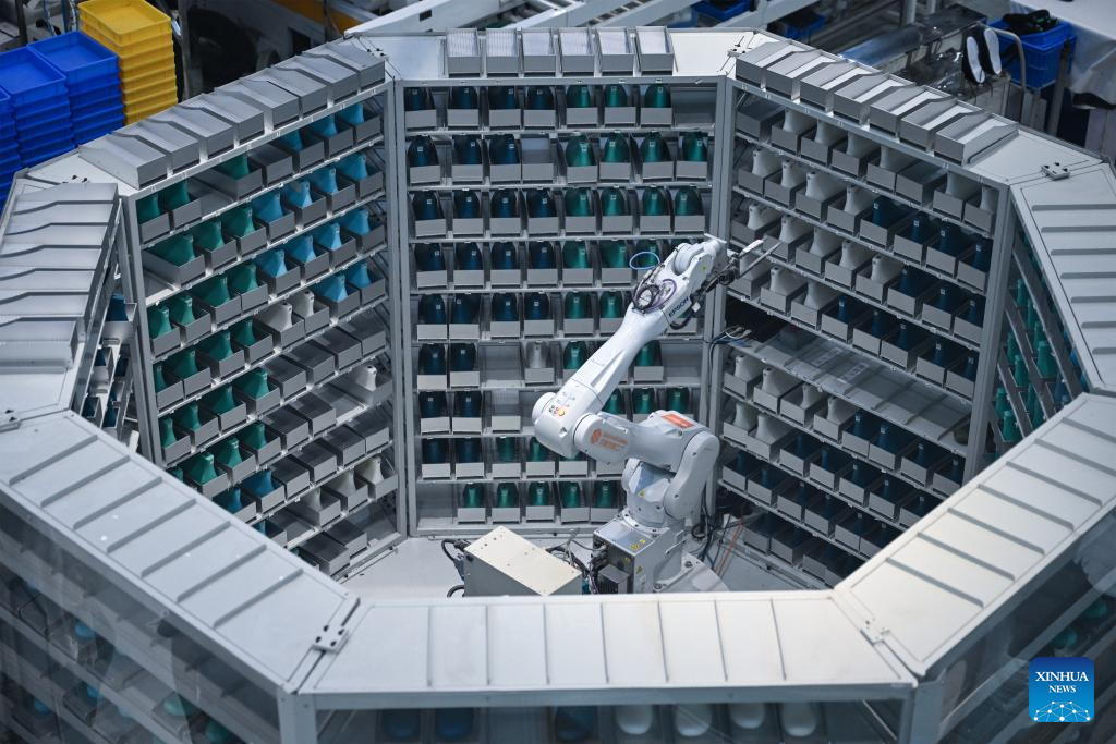 A mechanical arm is seen at the smart workshop of a footwear company in Putian, southeast China's Fujian Province, Aug. 19, 2025. At a custom-made factory in Putian, an equipment is recording a consumer' foot measurements to create personalized designs based on the consumer's preferences. The intelligent production line can then manufacture a pair of new shoes in just over an hour.