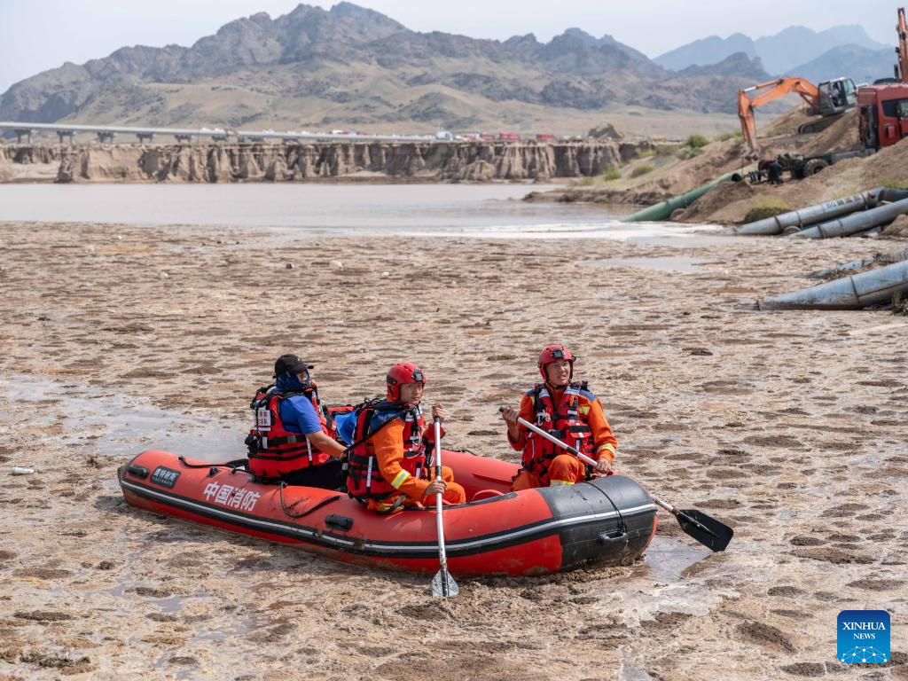 Firefighters search for missing individuals in Urad Rear Banner of Bayannur City, north China's Inner Mongolia Autonomous Region on Aug. 18, 2025. The death toll from a flash flood that swept through a wild camping site in north China's Inner Mongolia Autonomous Region has risen to ten, with two people still missing, local emergency authorities said on Sunday.