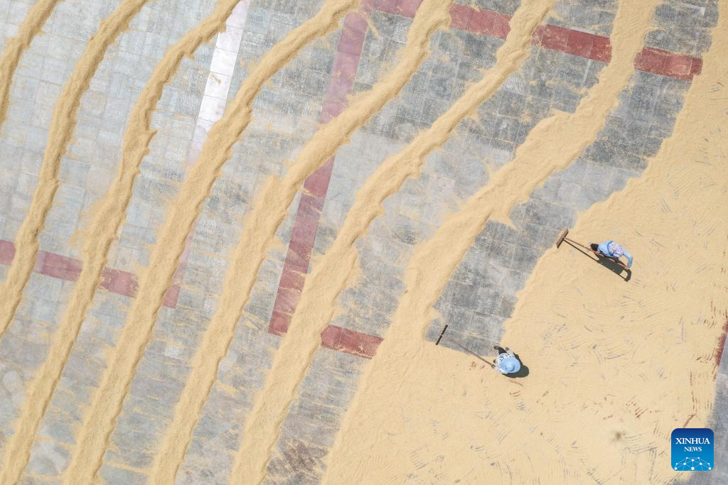 People dry grain at a government compound in Yongchuan District of southwest China's Chongqing Municipality, Aug. 20, 2025. In recent days, rice in Yongchuan District has entered the harvest season. Local government has provided public areas such as government compounds and cultural squares for farmers to dry grain. (Xinhua/Huang Wei)