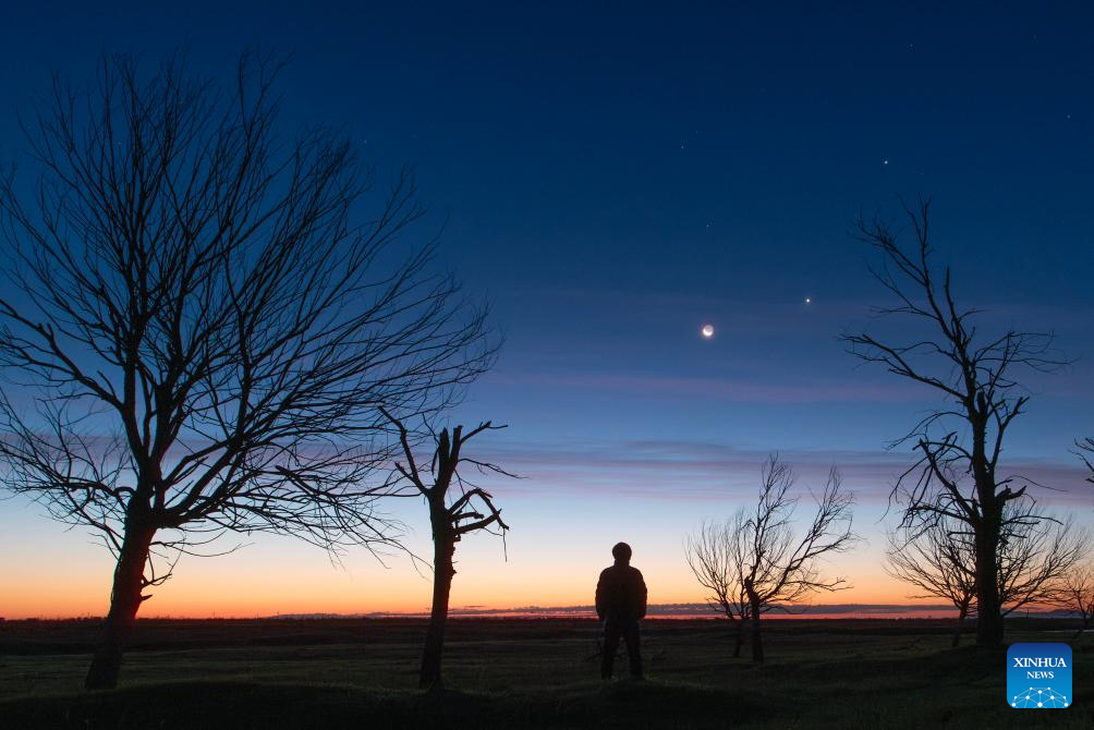 This photo taken on Aug. 21, 2025 shows the planets of Venus and Jupiter next to a crescent moon in the sky over Fujin City, northeast China's Heilongjiang Province. (Photo by Qu Yubao/Xinhua)