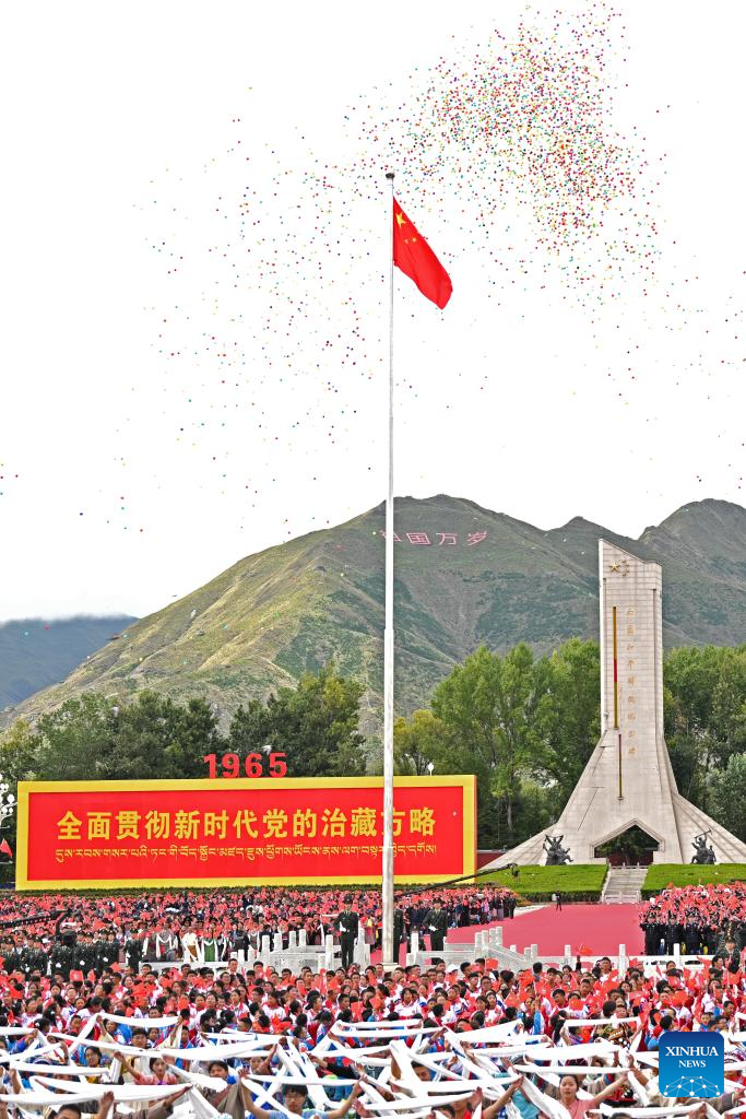 Balloons float upwards during a grand gathering to celebrate Xizang Autonomous Region's 60th founding anniversary in Lhasa, southwest China's Xizang Autonomous Region, Aug. 21, 2025. Around 20,000 local officials and people from all ethnic groups and all walks of life joined in the celebration. (Xinhua/Li Xiang)
