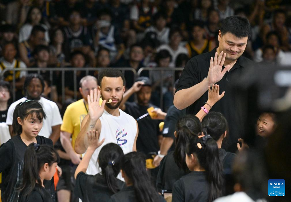 Yao Ming (top R) and Stephen Curry (top C) react with children during the NBA star Stephen Curry's Asia tour in southwest China's Chongqing Municipality, Aug. 20, 2025. (Xinhua/Chen Cheng)