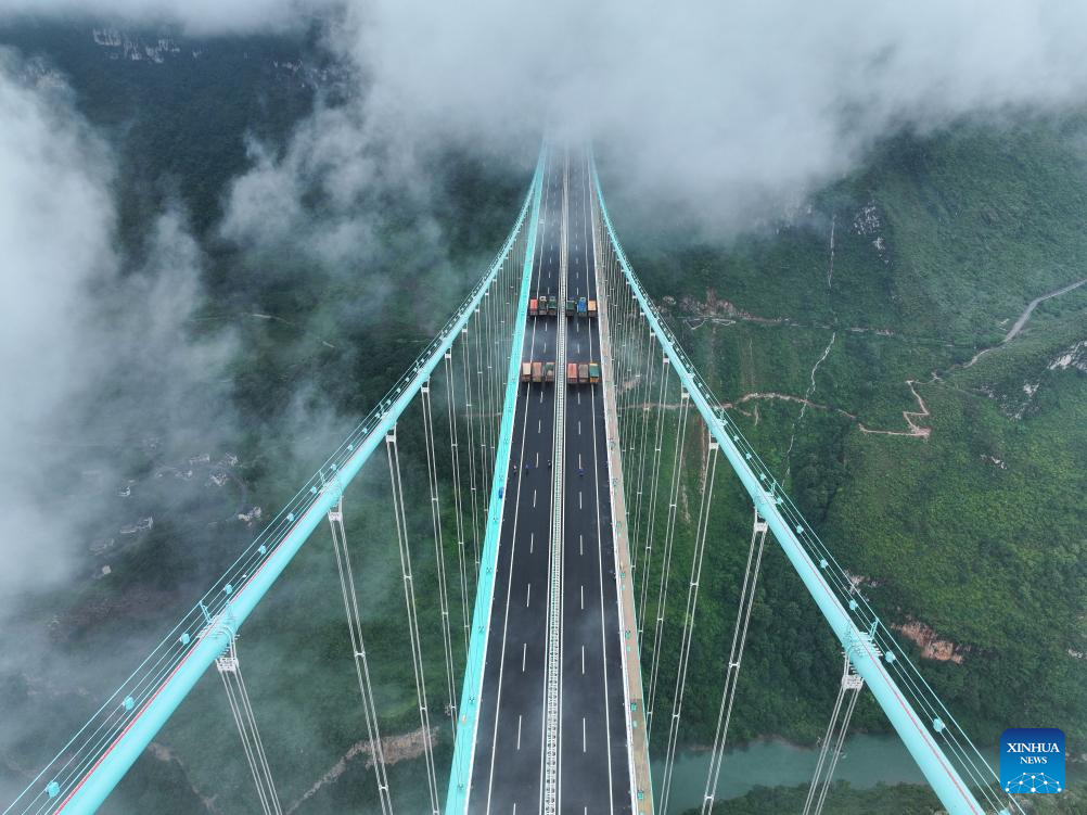 The 2,890-meter bridge, with a span of 1,420 meters, is also the world's largest span bridge to be built in a mountainous area. (Xinhua/Yang Wenbin)