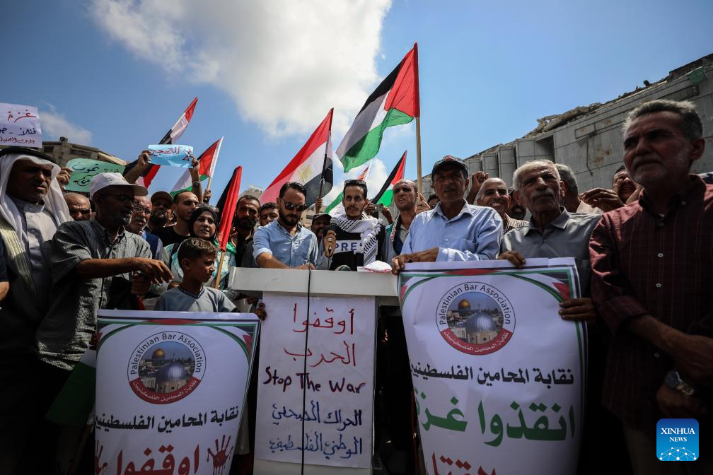 Palestinians participate in a protest demanding an end to the ongoing conflict with Israel and calling for international protection for civilians in Gaza City, on Aug. 21, 2025. (Photo by Rizek Abdeljawad/Xinhua)