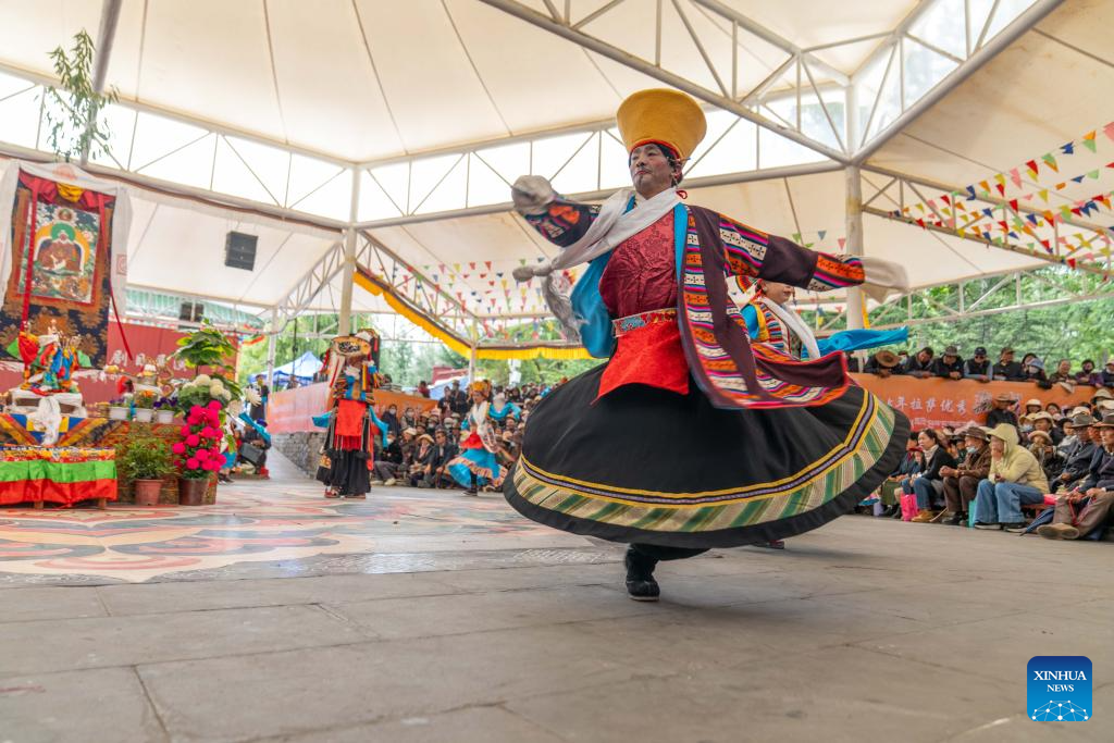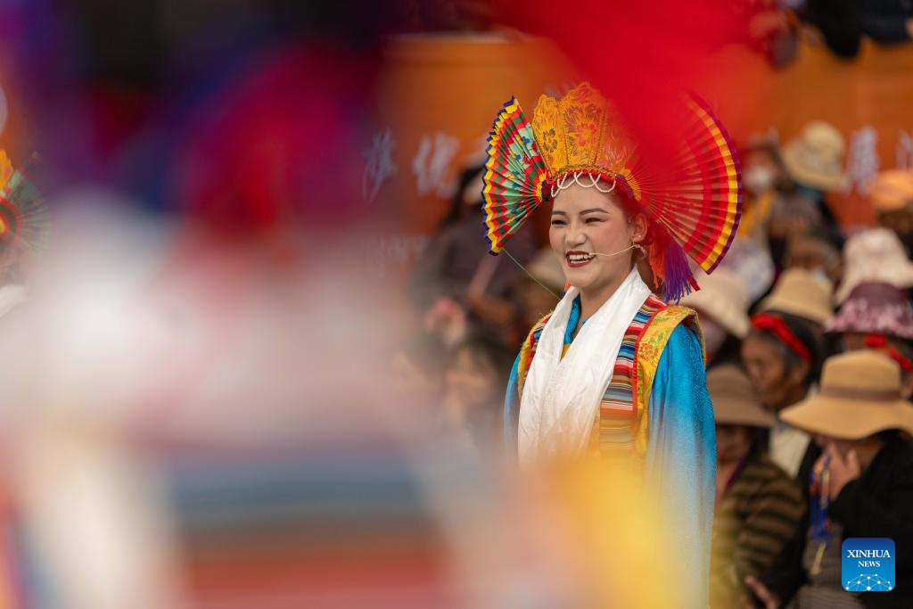 An artist participates in Tibetan opera performances in Lhasa, southwest China's Xizang Autonomous Region, Aug. 24, 2025. Tibetan opera performances are staged here from Aug. 23 to 27 in celebration of the traditional Shoton Festival, or Yogurt Festival, and the autonomous region's 60th founding anniversary. (Xinhua/Tenzing Nima Qadhup)