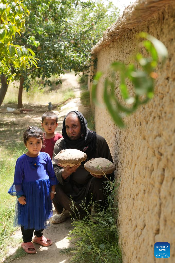 A villager, along with his children, shows two fully sealed Kangana jars in the northern outskirts of Kabul, the capital of Afghanistan, Aug. 25, 2025. The Kangana, an ancient clay jar to preserve grapes, has been widely used in the rural outskirts north of Kabul. This century-old Afghan container enables grapes harvested in the heat of summer to stay fresh until the following spring.