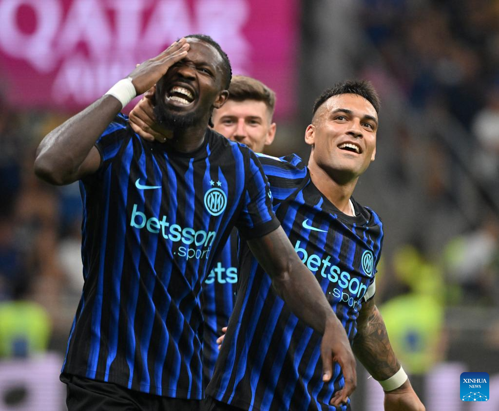 Inter Milan's Marcus Thuram (2nd R) scores during a Serie A football match between Inter Milan and Torino in Milan, Italy, Aug. 25, 2025. (Photo by Alberto Lingria/Xinhua)