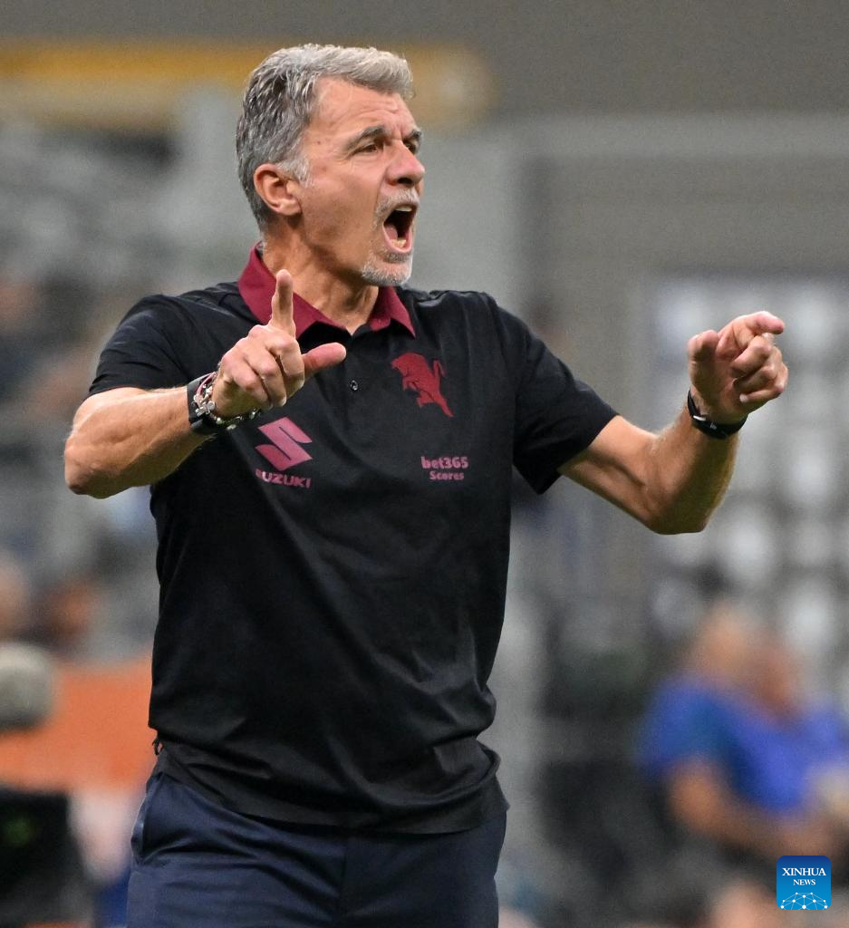 Torino's head coach Marco Baroni gestures during a Serie A football match between Inter Milan and Torino in Milan, Italy, Aug. 25, 2025. (Photo by Alberto Lingria/Xinhua)