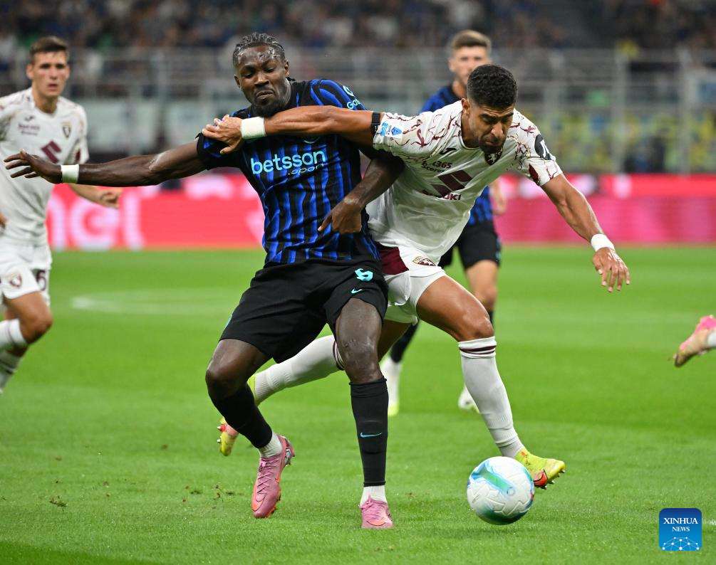 Torino's Adam Masina (R) vies with Inter Milan's Marcus Thuram during a Serie A football match between Inter Milan and Torino in Milan, Italy, Aug. 25, 2025. (Photo by Alberto Lingria/Xinhua)