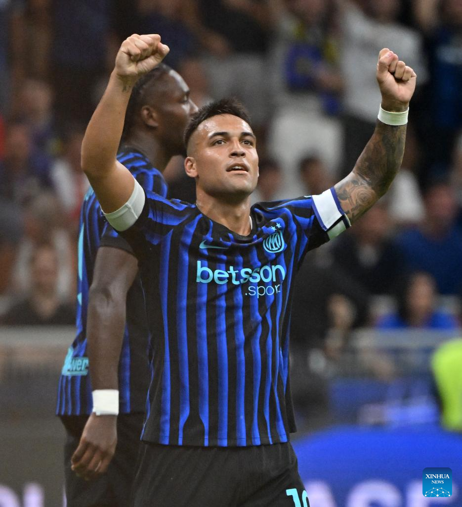 Inter Milan's Lautaro Martinez (front) celebrates his goal during a Serie A football match between Inter Milan and Torino in Milan, Italy, Aug. 25, 2025. (Photo by Alberto Lingria/Xinhua)