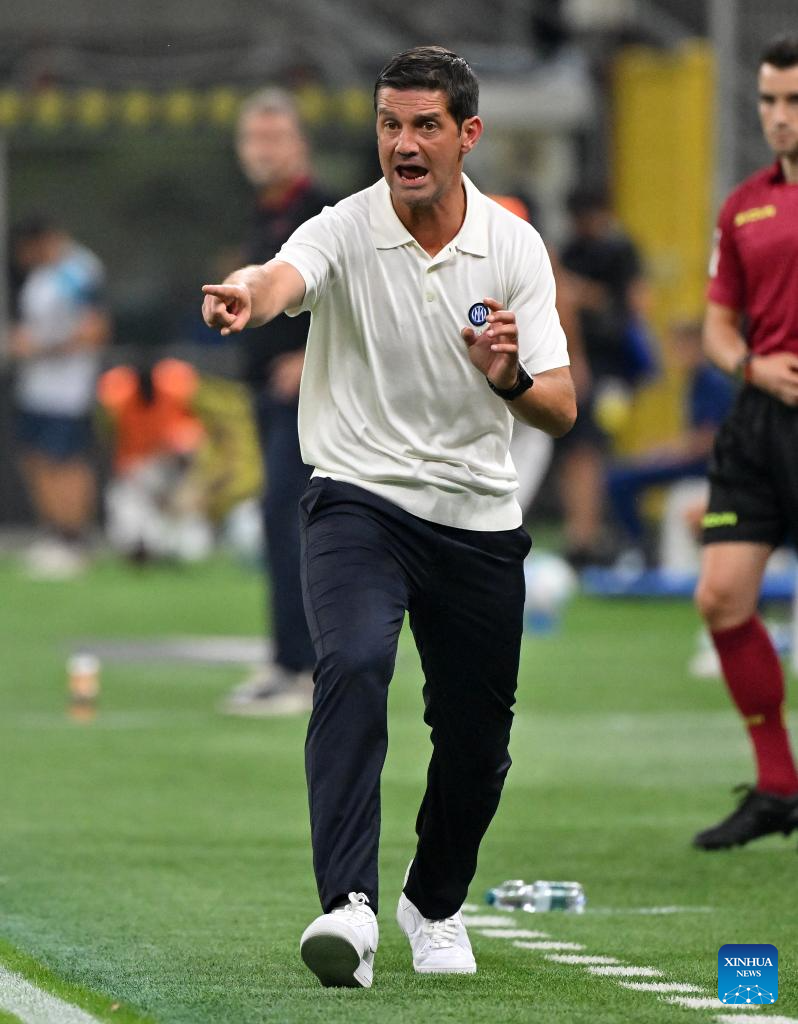 Inter Milan's head coach Christian Chivu gestures during a Serie A football match between Inter Milan and Torino in Milan, Italy, Aug. 25, 2025. (Photo by Alberto Lingria/Xinhua)