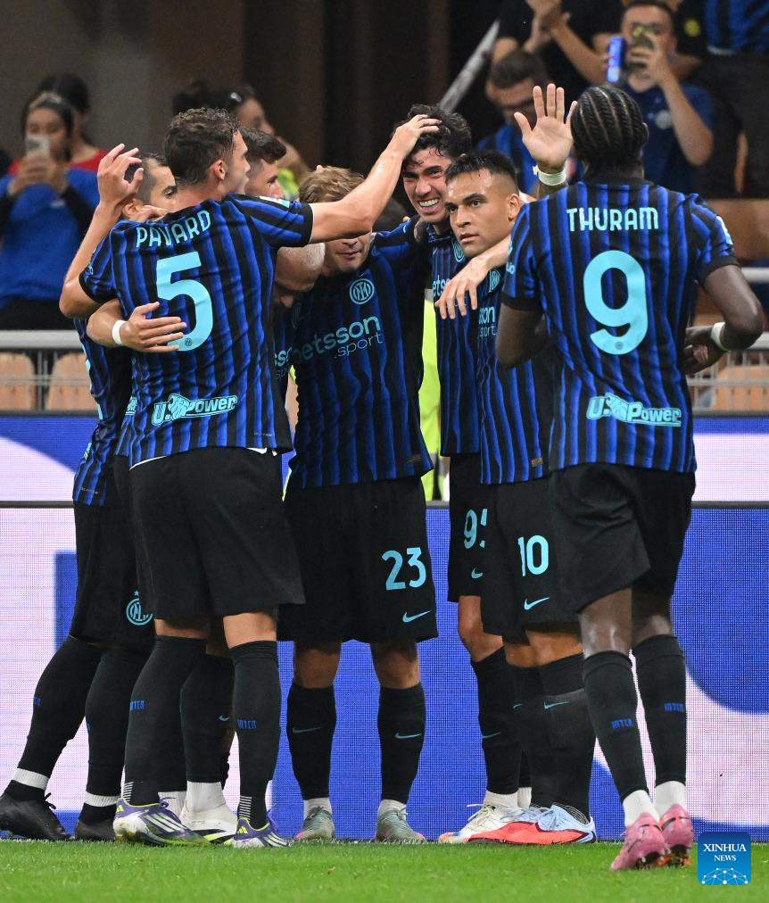 Inter Milan's Alessandro Bastoni (3rd R) celebrates his goal with his teammates during a Serie A football match between Inter Milan and Torino in Milan, Italy, Aug. 25, 2025. (Photo by Alberto Lingria/Xinhua)