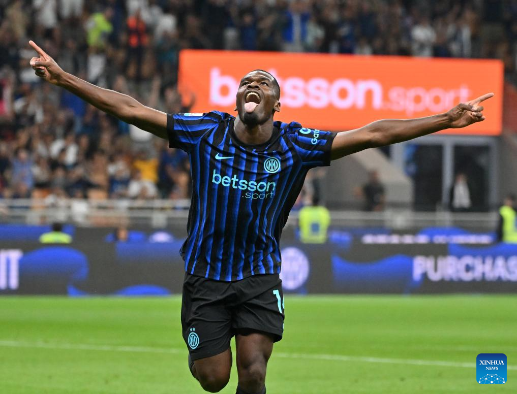 Inter Milan's Marcus Thuram celebrates his goal during a Serie A football match between Inter Milan and Torino in Milan, Italy, Aug. 25, 2025. (Photo by Alberto Lingria/Xinhua)
