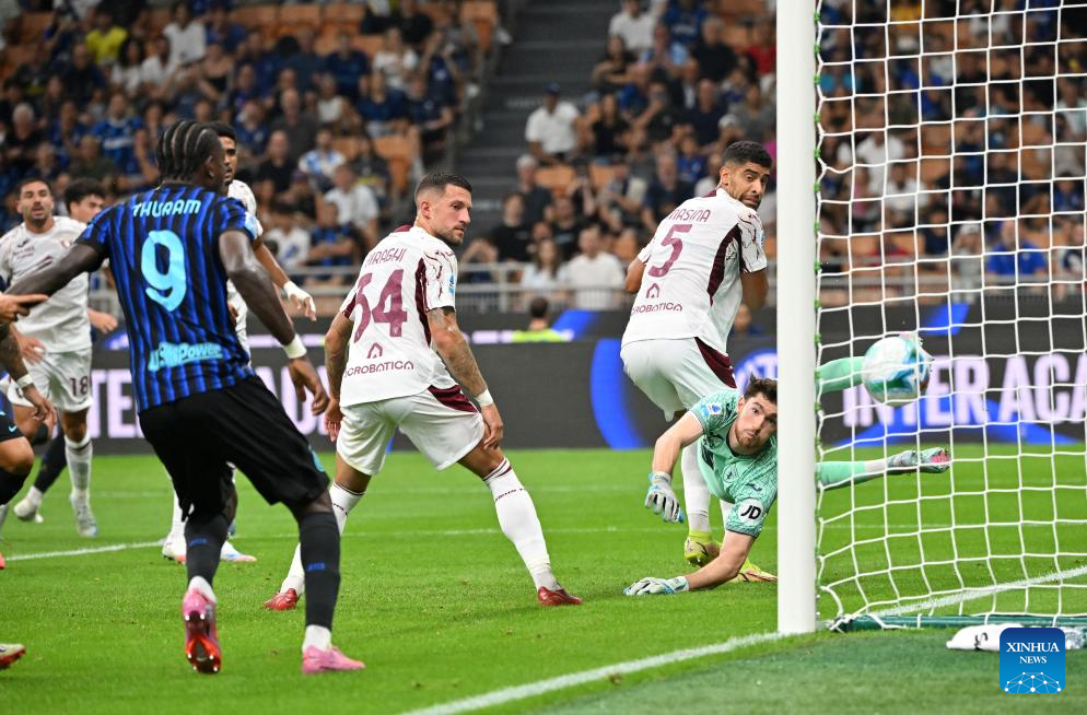 Torino's goalkeeper Franco Israel (1st R) fails to save the goal of Inter Milan's Alessandro Bastoni during a Serie A football match between Inter Milan and Torino in Milan, Italy, Aug. 25, 2025. (Photo by Alberto Lingria/Xinhua)