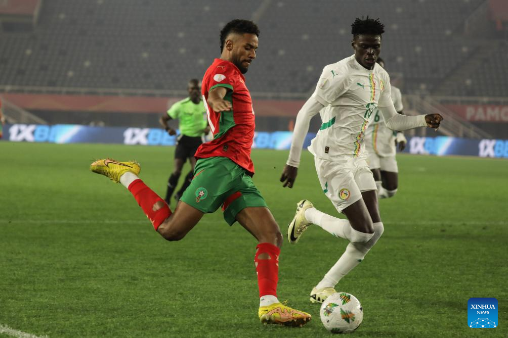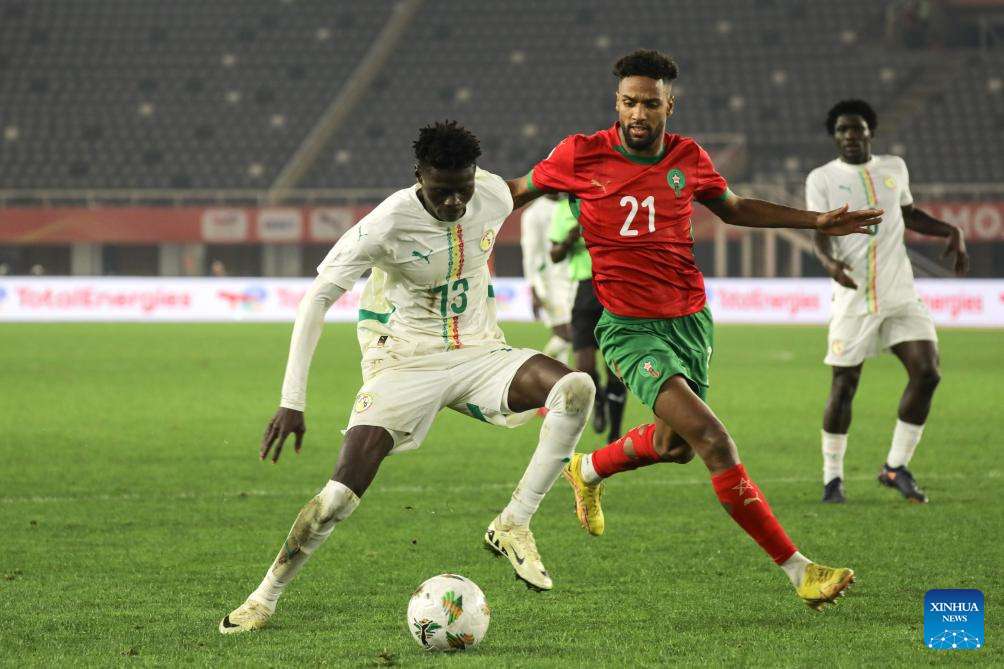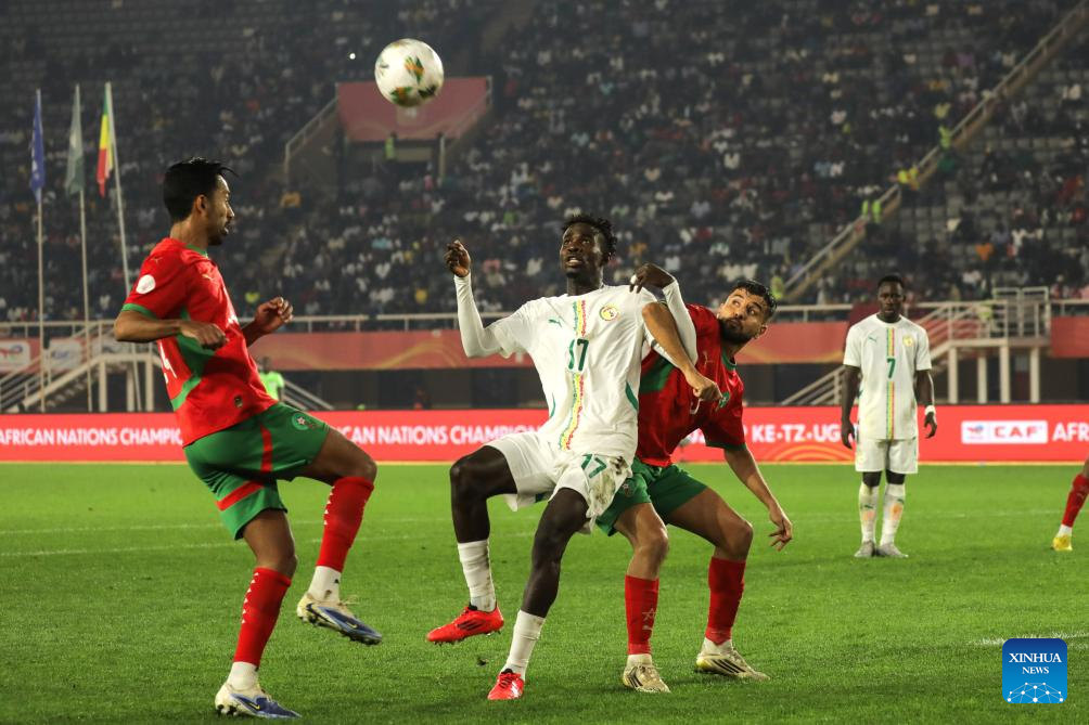 Mbaye Yaya Ly (2nd L) of Senegal vies for the ball during the semifinal match between Senegal and Morocco at the African Nations Championship (CHAN) 2024 at Mandela National Stadium in Kampala, capital of Uganda, on Aug. 26, 2025. (Photo by Hajarah Nalwadda/Xinhua)