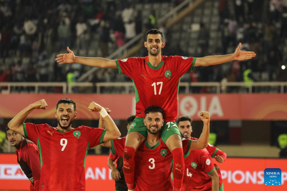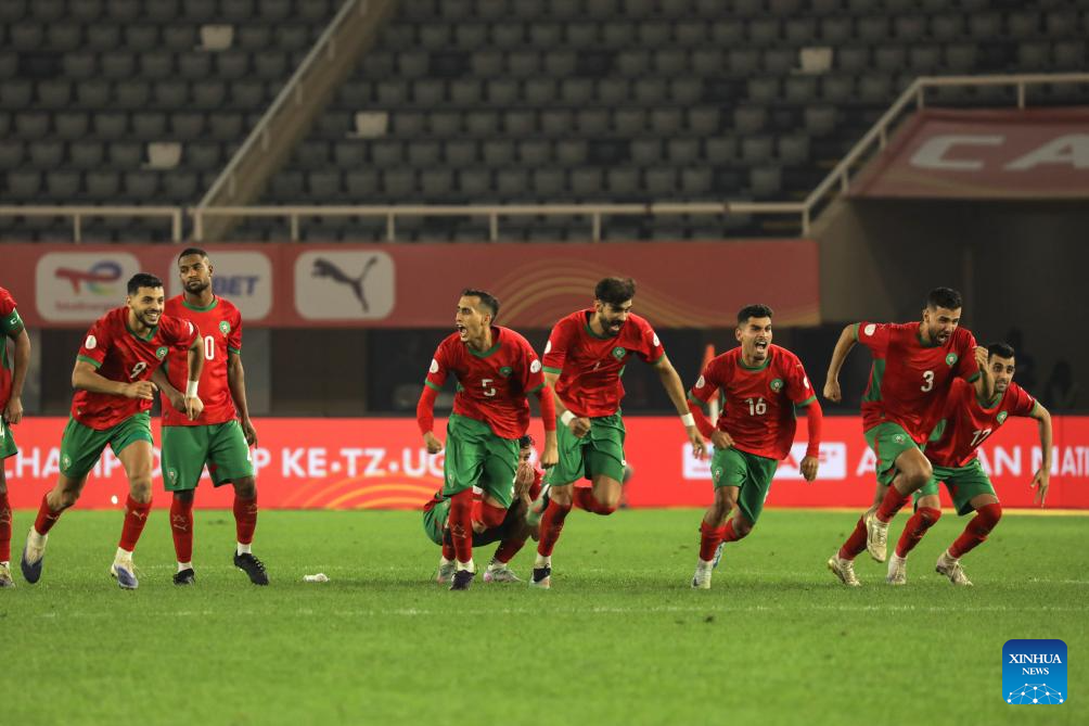 Players of Morocco celebrate after defeating Senegal in penalty shoots of the semifinal match between Senegal and Morocco at the African Nations Championship (CHAN) 2024 at Mandela National Stadium in Kampala, capital of Uganda, on Aug. 26, 2025. (Photo by Hajarah Nalwadda/Xinhua)