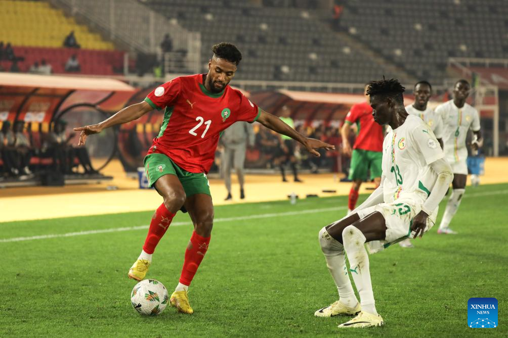 Youssef Mehri (L) of Morocco controls the ball against Joseph Layousse Ifra Samb of Senegal during the semifinal match between Senegal and Morocco at the African Nations Championship (CHAN) 2024 at Mandela National Stadium in Kampala, capital of Uganda, on Aug. 26, 2025. (Photo by Hajarah Nalwadda/Xinhua)