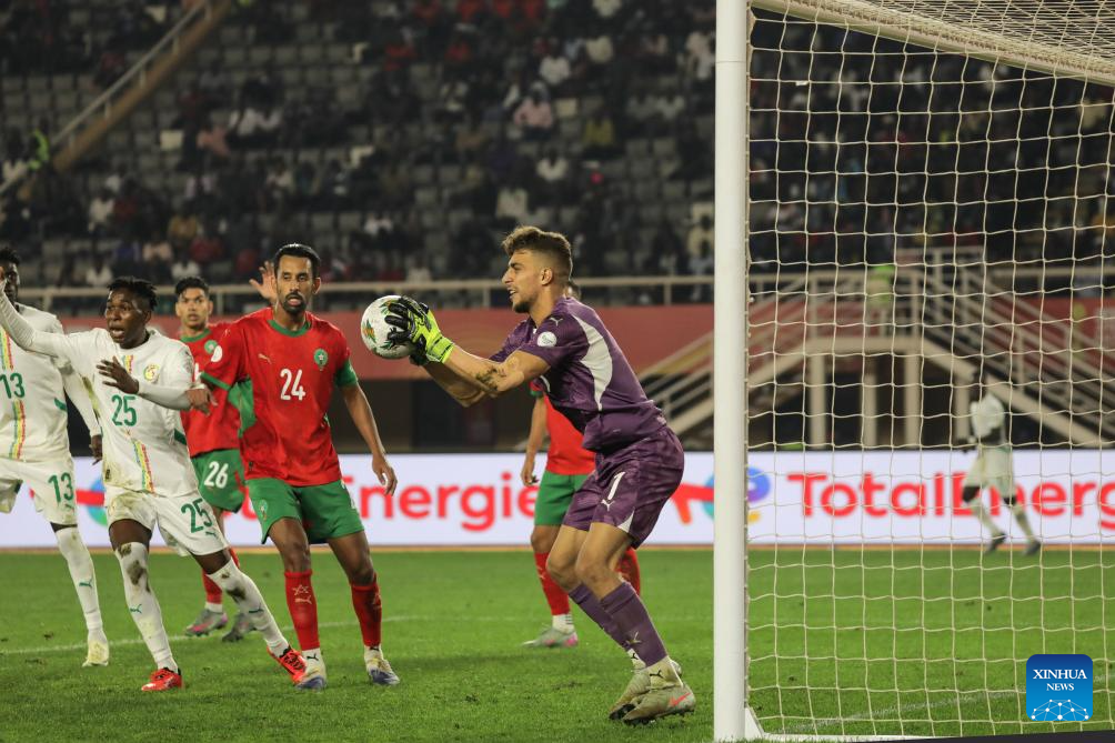 Elmehdi Al Harrar (1st R), goalkeeper of Morocco, catches the ball during the semifinal match between Senegal and Morocco at the African Nations Championship (CHAN) 2024 at Mandela National Stadium in Kampala, capital of Uganda, on Aug. 26, 2025. (Photo by Hajarah Nalwadda/Xinhua)