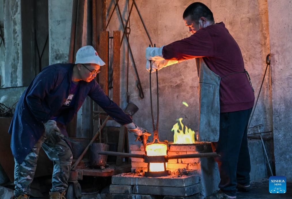Ao Xinghua and his brother Ao Xingqiang pour molten copper into a mould at Ao's family workshop in Buhe Town of Jingzhou City, central China's Hubei Province, June 17, 2025.