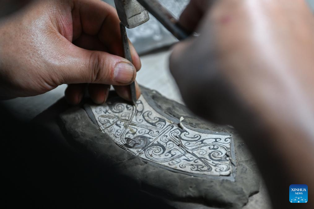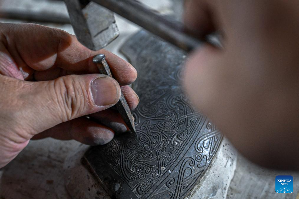 Ao Xinghua engraves on a piece of lead-tin alloy at Ao's family workshop in Buhe Town of Jingzhou City, central China's Hubei Province, June 16, 2025.