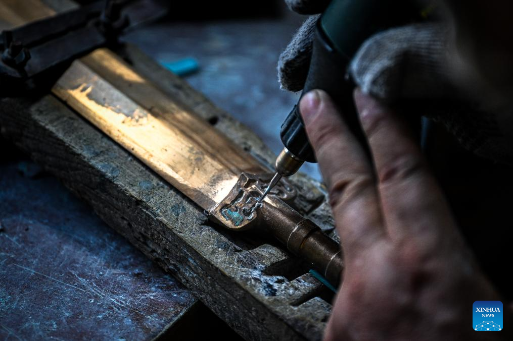 Ao Xinghua inlays turquoise into the handguard of a sword at Ao's family workshop in Buhe Town of Jingzhou City, central China's Hubei Province, June 16, 2025.