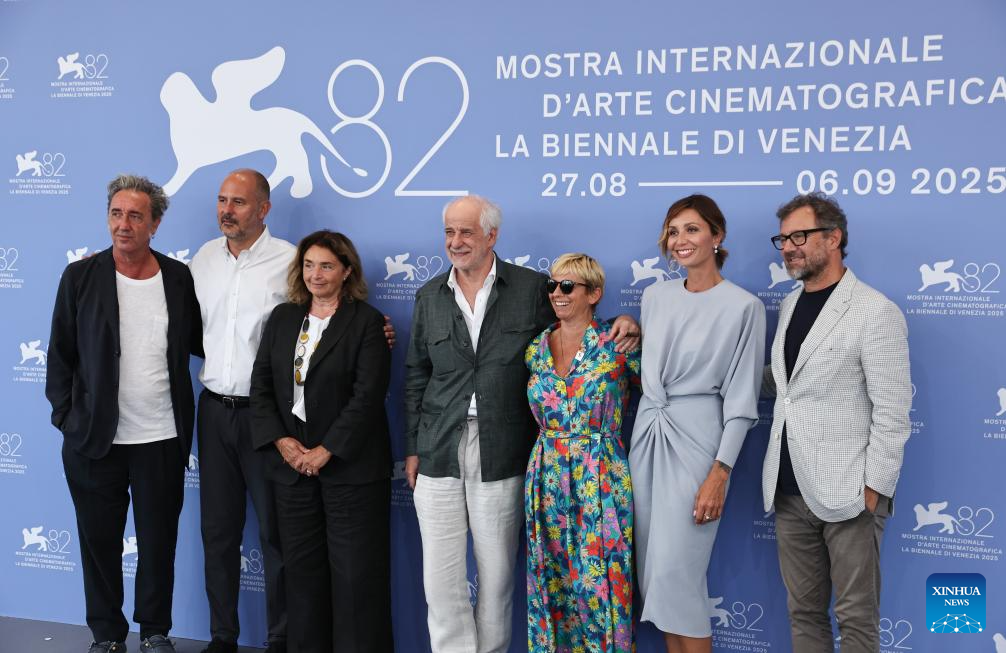 Main crew of the film "La Grazia" pose for a group photo at the photocall of the 82nd Venice Film Festival in Venice, Italy, Aug. 27, 2025. The 82nd Venice Film Festival opened Wednesday on Lido island in Venice, Italy, with 21 films competing for the Golden Lion award. (Xinhua/Li Jing)