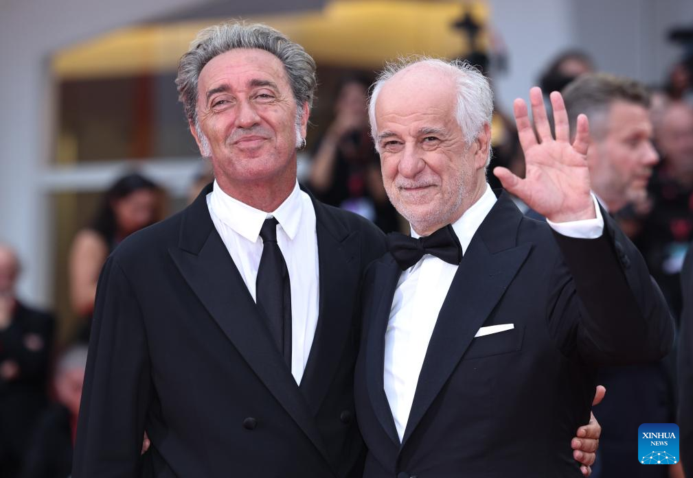 Director Paolo Sorrentino (L) and actor Toni Servillo of the film "La Grazia" pose for a photo at the red carpet of the opening ceremony of the 82nd Venice Film Festival in Venice, Italy, Aug. 27, 2025. The 82nd Venice Film Festival opened Wednesday on Lido island in Venice, Italy, with 21 films competing for the Golden Lion award. (Xinhua/Li Jing)