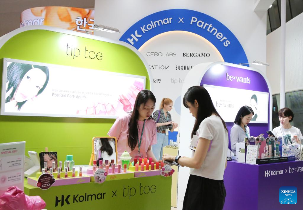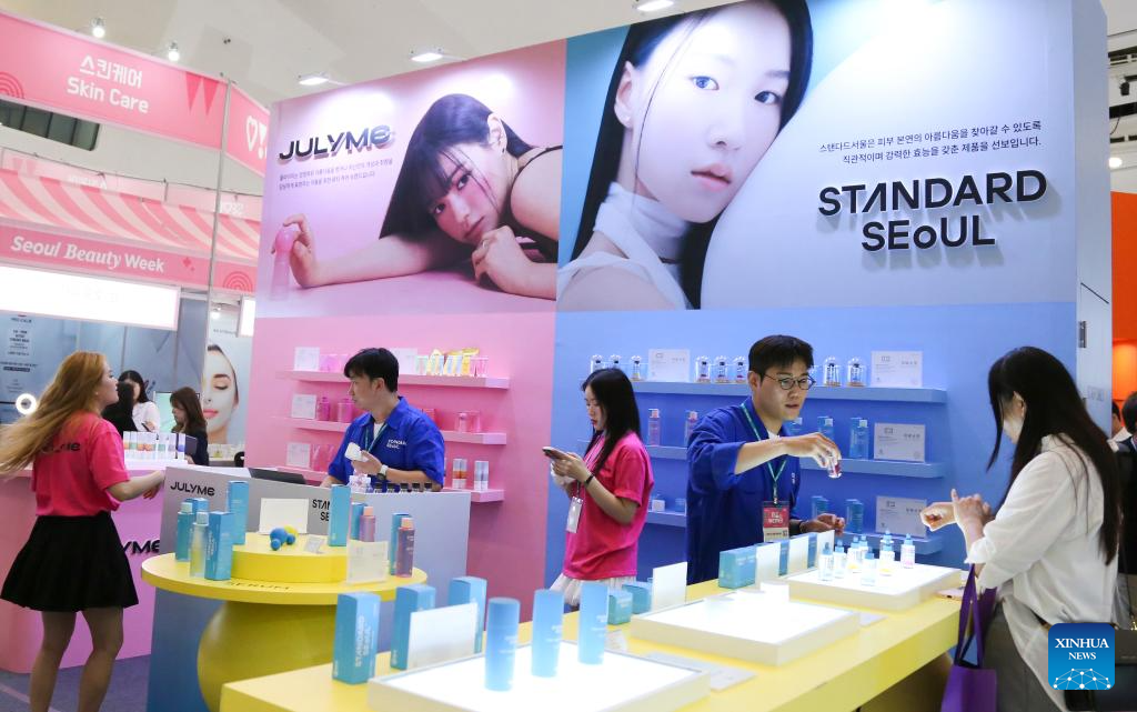 People are seen at the Seoul Beauty Week event in Seoul, South Korea, Aug. 28, 2025. The three-day Beauty Week event kicked off in Seoul on Thursday, attracting numerous cosmetics brands and professionals to attend. (Xinhua/Yao Qilin)